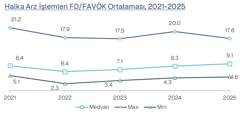 Halka arz öncesi hisse değerlerinin işaret ettiği ABD doları bazlı FD/FAVÖK çarpanı, 2025 yılında ortalama 9.1x olarak gerçekleşti. Bu oran, 2024 yılındaki 8.3x seviyesinin ve son beş yılın ortalaması olan 7.9x seviyesinin üzerindedir.